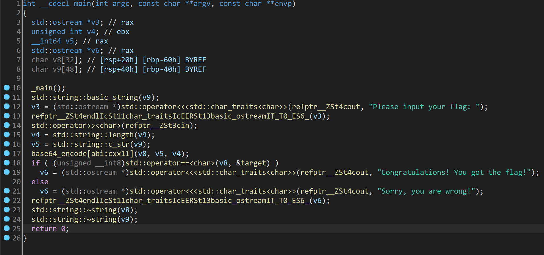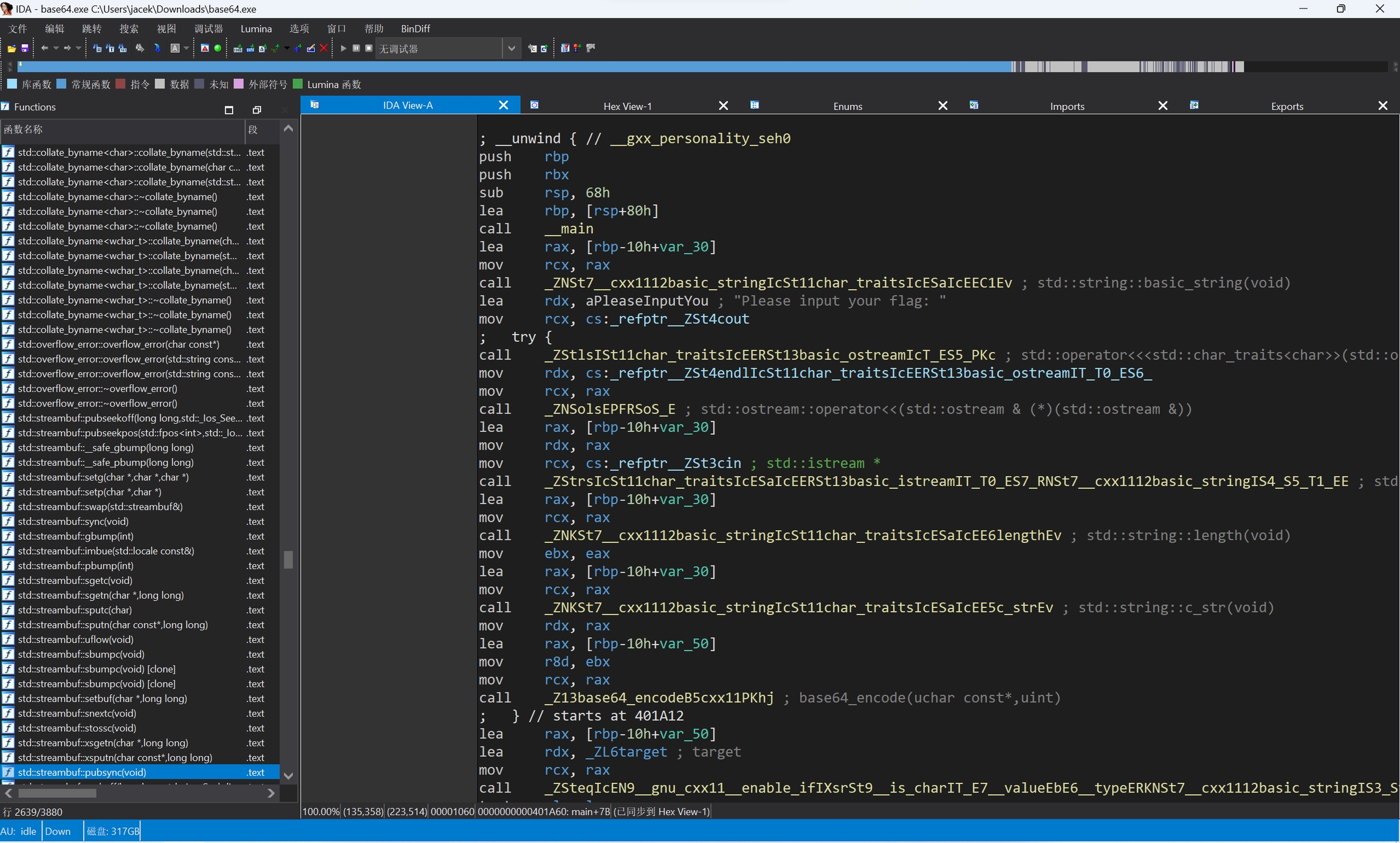 用ida打开,发现疑似是一个将输入的字符串Base64编码后于另一个字符串(编码后的flag)进行比较的程序