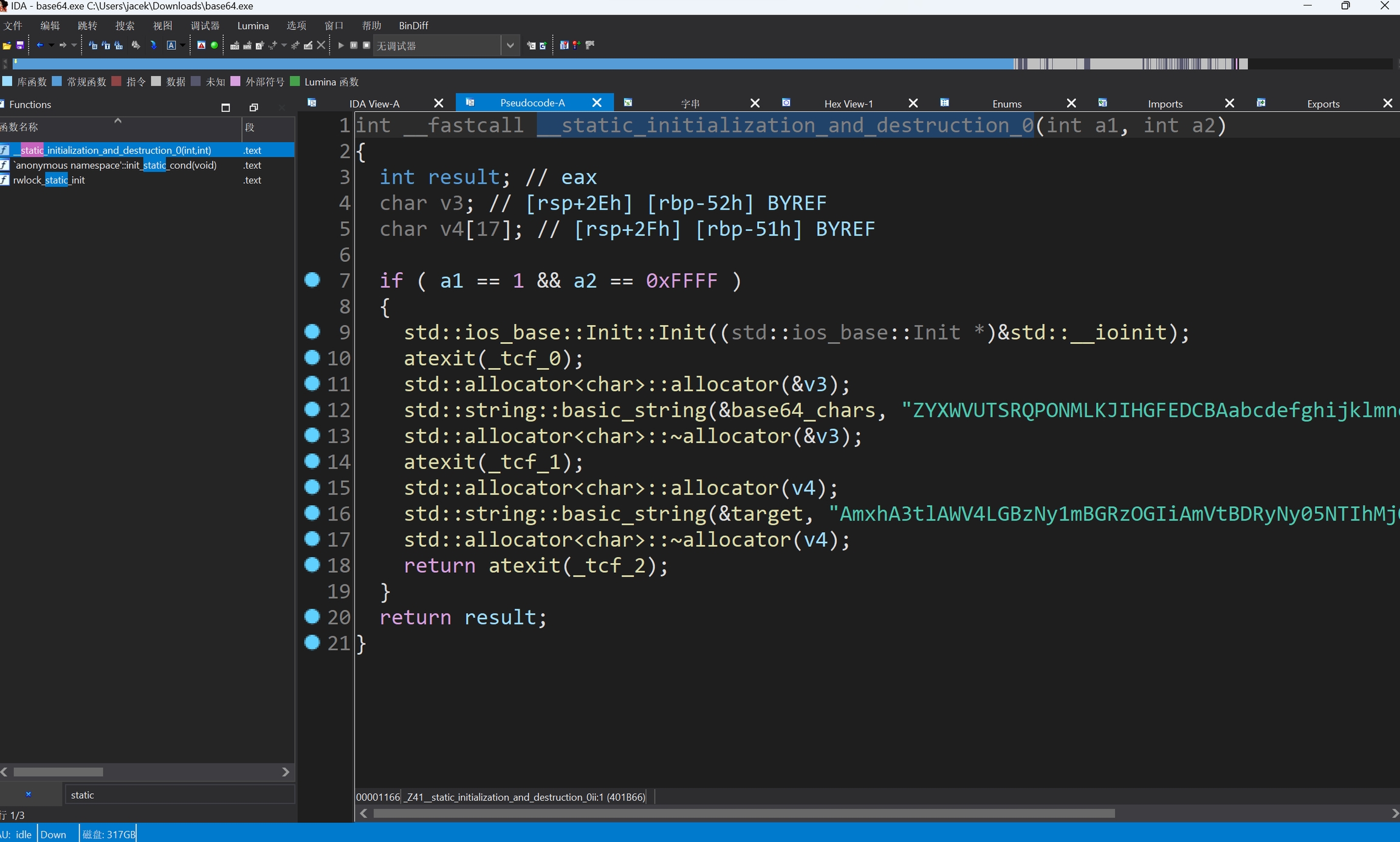 观察函数没有得到有效的信息,按Shift+F12查看字符串,发现有一个疑似自定义Base64字符集和编码后的flag的字符串