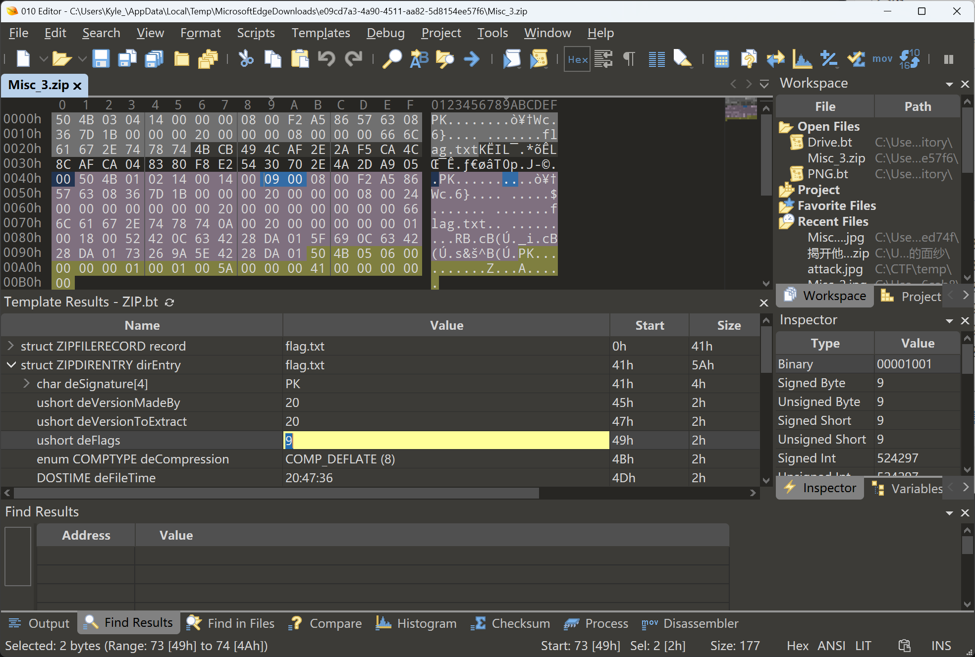 通过阅读题面,怀疑是压缩包伪加密。使用010 Editor打开,发现"struct ZIPFILERECORD record"的"enum COMPTYPE frCompression"(全局加密标志)与"struct ZIPDIRENTRY dirEntry"的"ushort deFlags"(单个文件加密标志)不一致,将后者改为8,保存后解压,得到flag