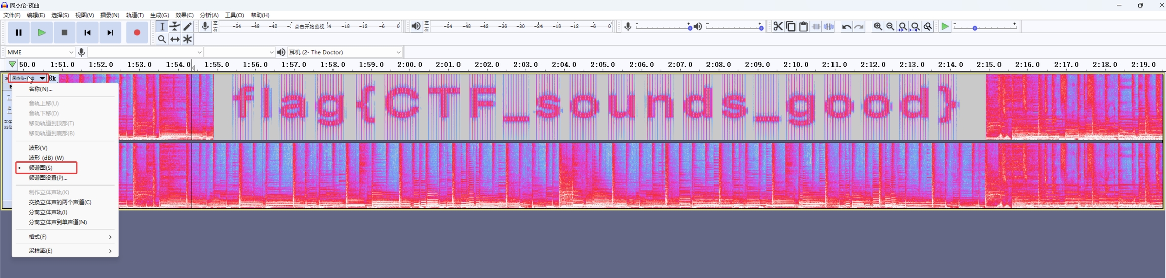 听音频,发现有一段声音有问题,用Audacity或Adobe Audition打开,使用频谱图直接看到flag