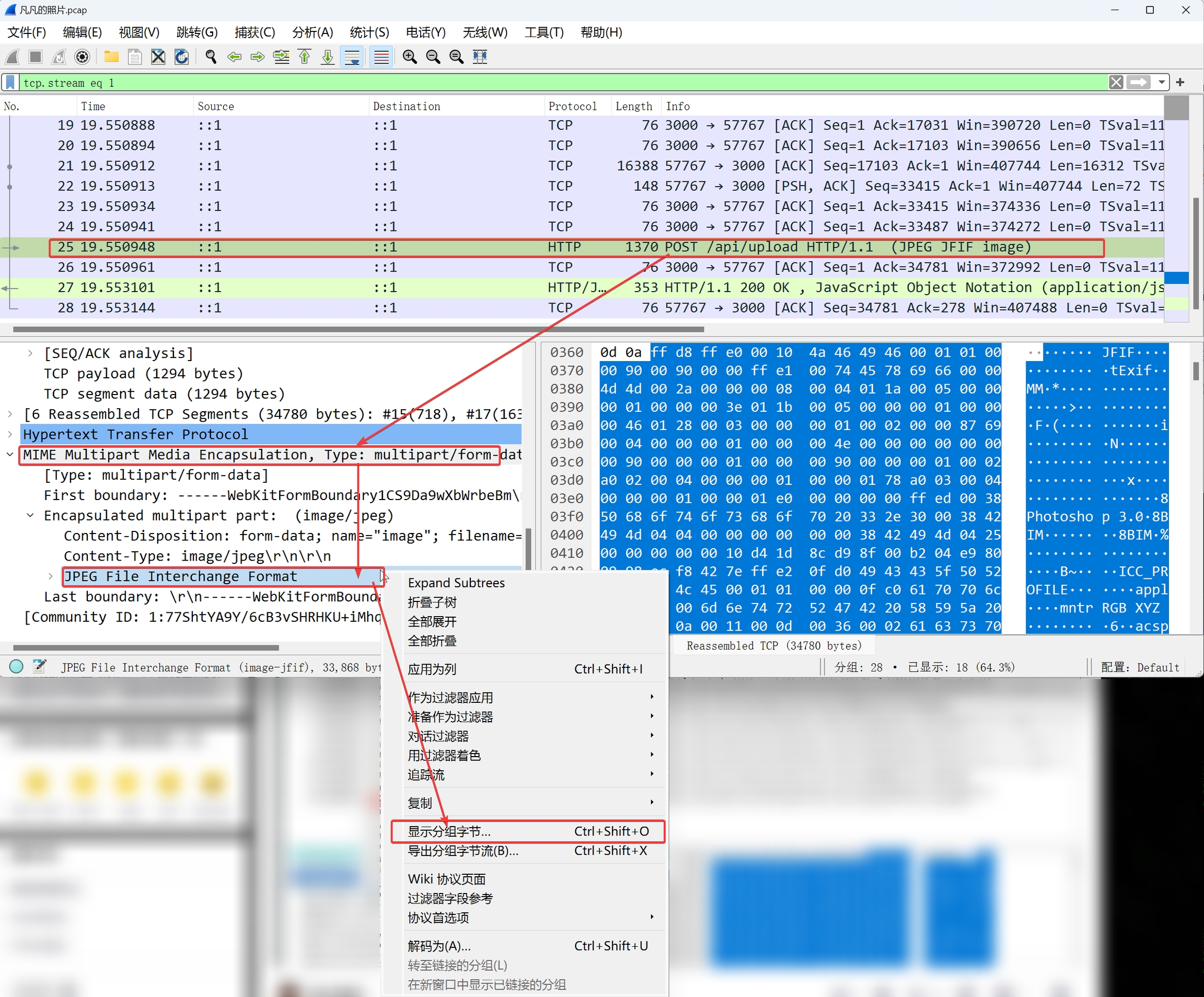 显示分组字节,自动渲染图片