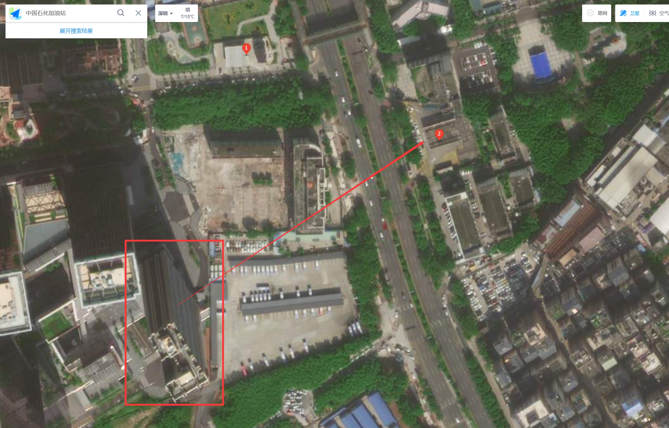 观察题目给的图片,发现对面有一座中国石化加油站。在比赛地点附近搜索,并比对图片与卫星图中的马路、天桥、周围建筑等特征,找到拍摄人所处的楼宇是“鸿荣源·天俊D栋”