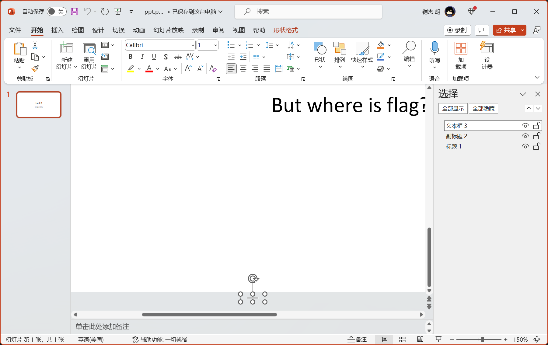 打开PPT后发现需要寻找flag,按下Ctrl+F搜索“flag”或用Ctrl+A全选或打开选择窗格发现有一段隐藏的文本,即为flag