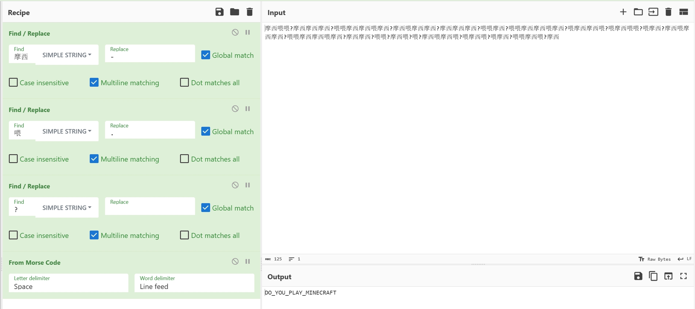 观察文本内容,发现共有3种字词,分别是摩西、喂、?,并且?疑似作为分隔符,结合题目名,猜测是摩斯密码,将摩西和喂分别替换为-和.,?替换为空格,摩斯解码后即可得到明文。